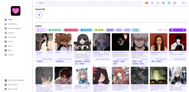 When you sign up on NSFWCharacter.AI, you can have conversations with various characters created by other users. Most of the characters on this site are female (18 out of the top 20), so if you want to chat with a male anime or hentai character, you might need to create one yourself.