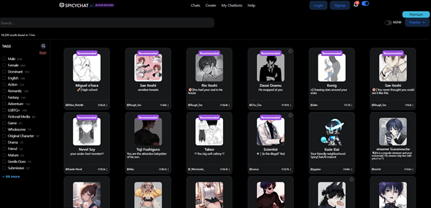 The amount of anime released each year increases, and the same goes for hentai and manga. With that said, it should come as no surprise that Spicychat.AI already has thousands of characters to choose from. At the time of writing this, there are over 8000 male characters alone, so you can imagine the number of total characters that the platform has to offer.