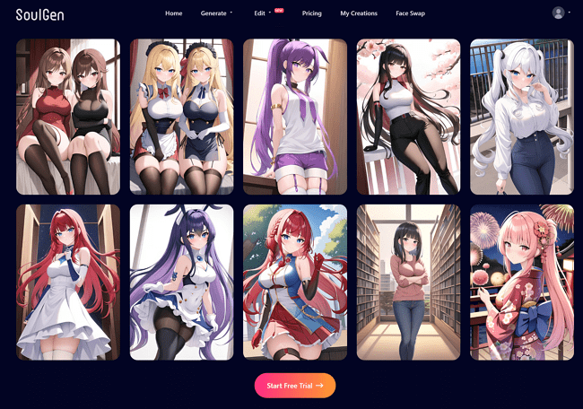 Users may generate real-world or anime graphics with text prompts using SoulGen AI, an artificial intelligence art generator. It is an intuitive AI image generator that works hard to realize users' aspirations. Users may use the program to quickly create art with just a few essential words to describe their ideal girl. A sizable collection of NSFW stuff, such as images of people, anime, and fantastical creatures, is available on the SoulGen AI website.
