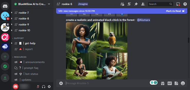 Upon joining the Blue Willow Discord server, you can promptly generate images based on your provided prompts. This versatile tool finds extensive application in crafting comic book characters, logos, landscapes, visual concepts, and various forms of digital artwork.