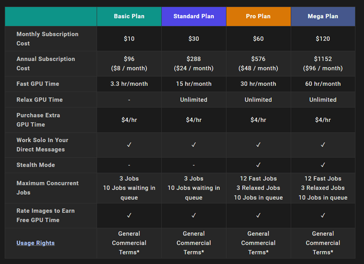 Midjourney avails of four membership options. Members can access the gallery, commercial usage terms, and the official Discord server, regardless of the chosen tier.