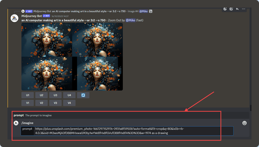 Top Tip: You can actually upload an image to the Midjourney private message, right-click it, copy the image URL, and then use this address in your prompt.